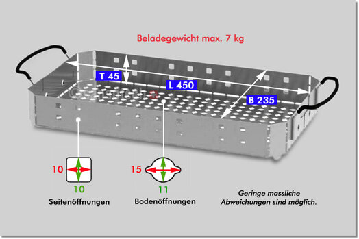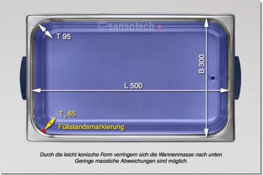 Innenmasse Wanne Länge x Breite x Tiefe ca. | 500 x 300 x 95 mm, oben am Rand gemessen |