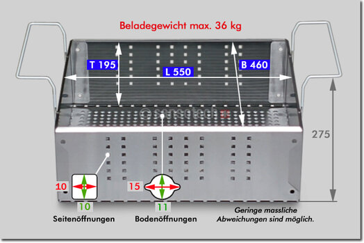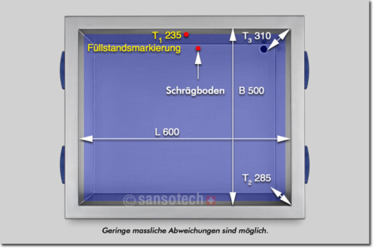 600 x 580 x 285/310 mm (mit Schrägboden zum besseren Entleeren)